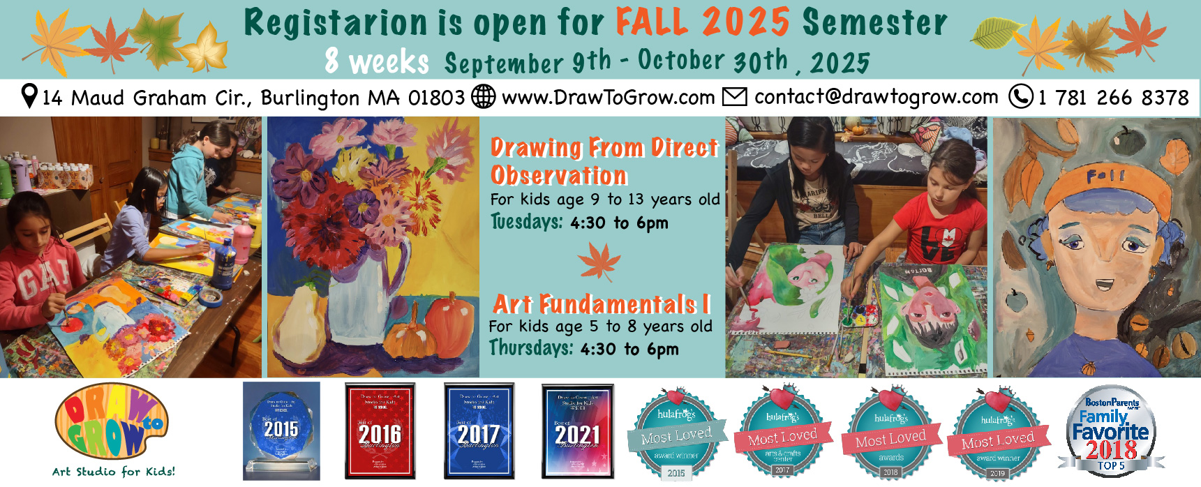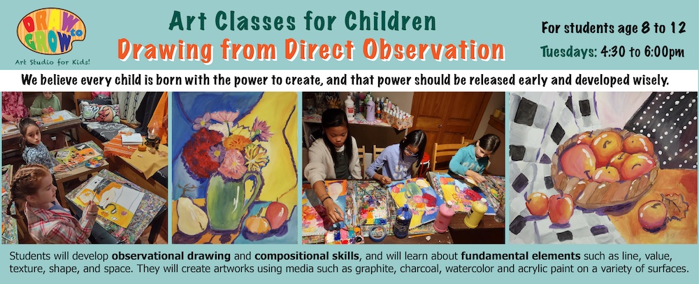DRAWING FROM DIRECT OBSERVATION - Tuesdays, 4:30-6pm, for students age 9-13 years old. Students will develop observational drawing and compositional skills, while observing the subject carefully and paying attention to its shape, form, texture, light and shadow.